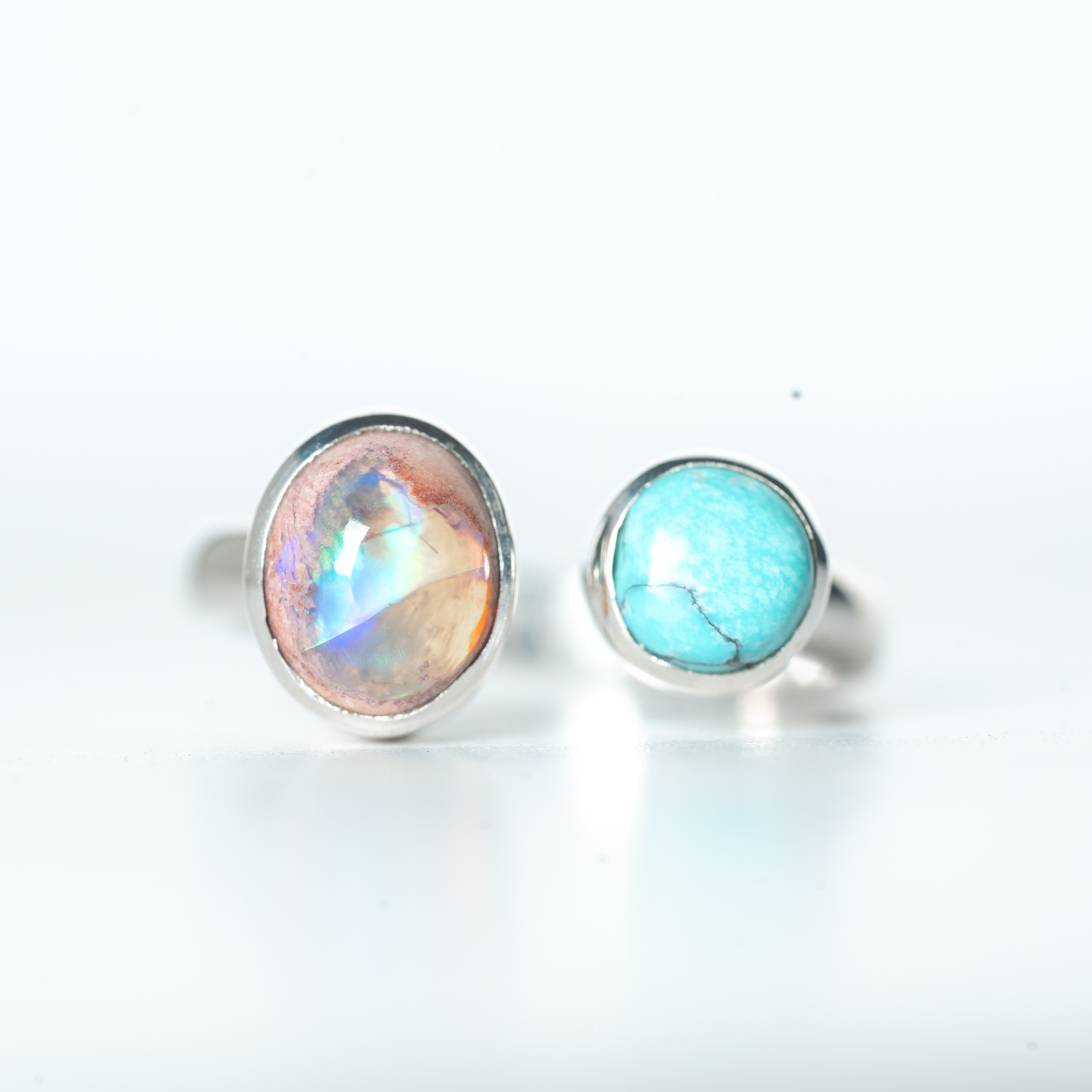 - Anillo ajustable hecho a mano de plata 925 con Ópalo de Fuego mexicano y Turquesa.