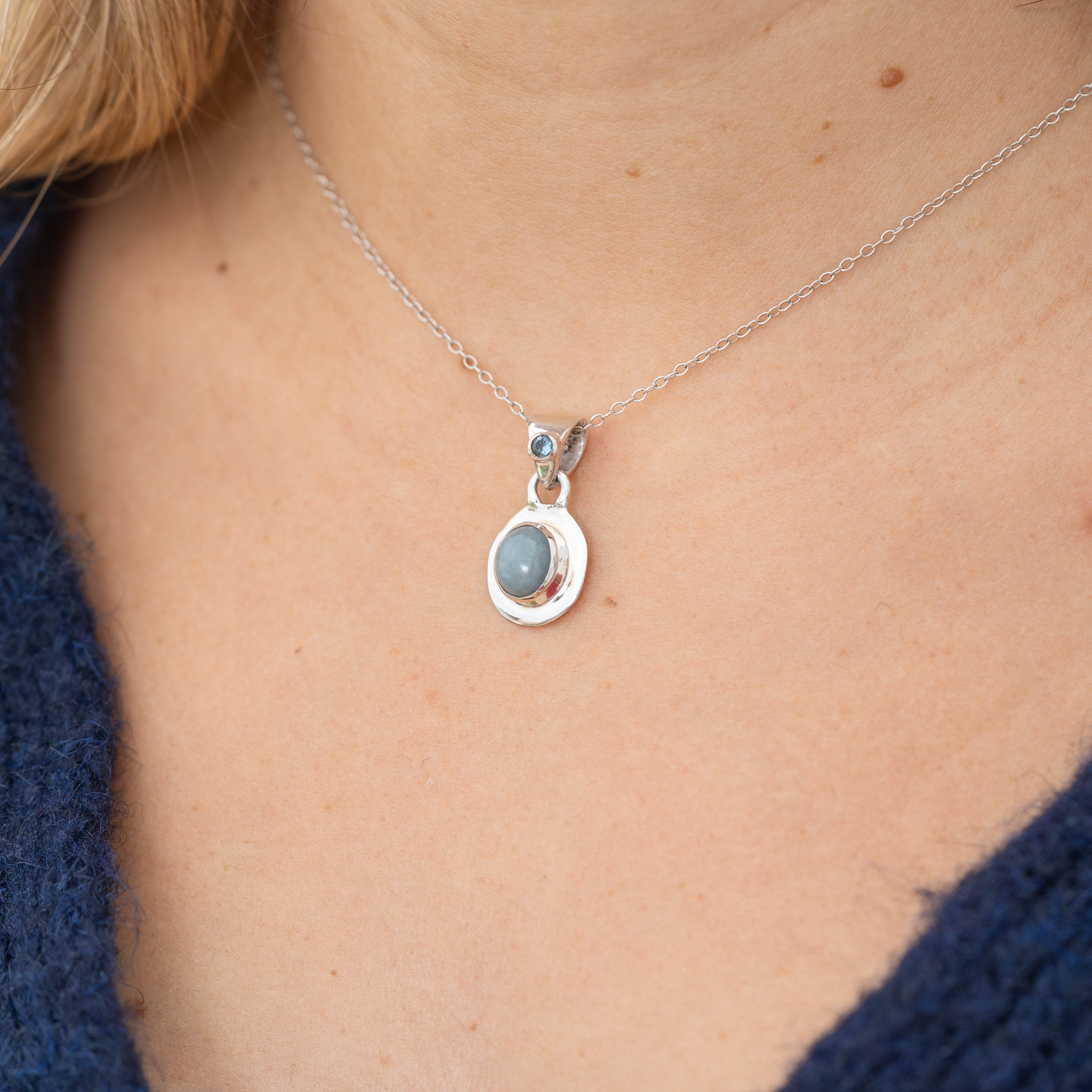 Colgante de plata 925 hecho a mano con Jade Esmeralda de Guatemala y Zafiro Azul talla diamante.