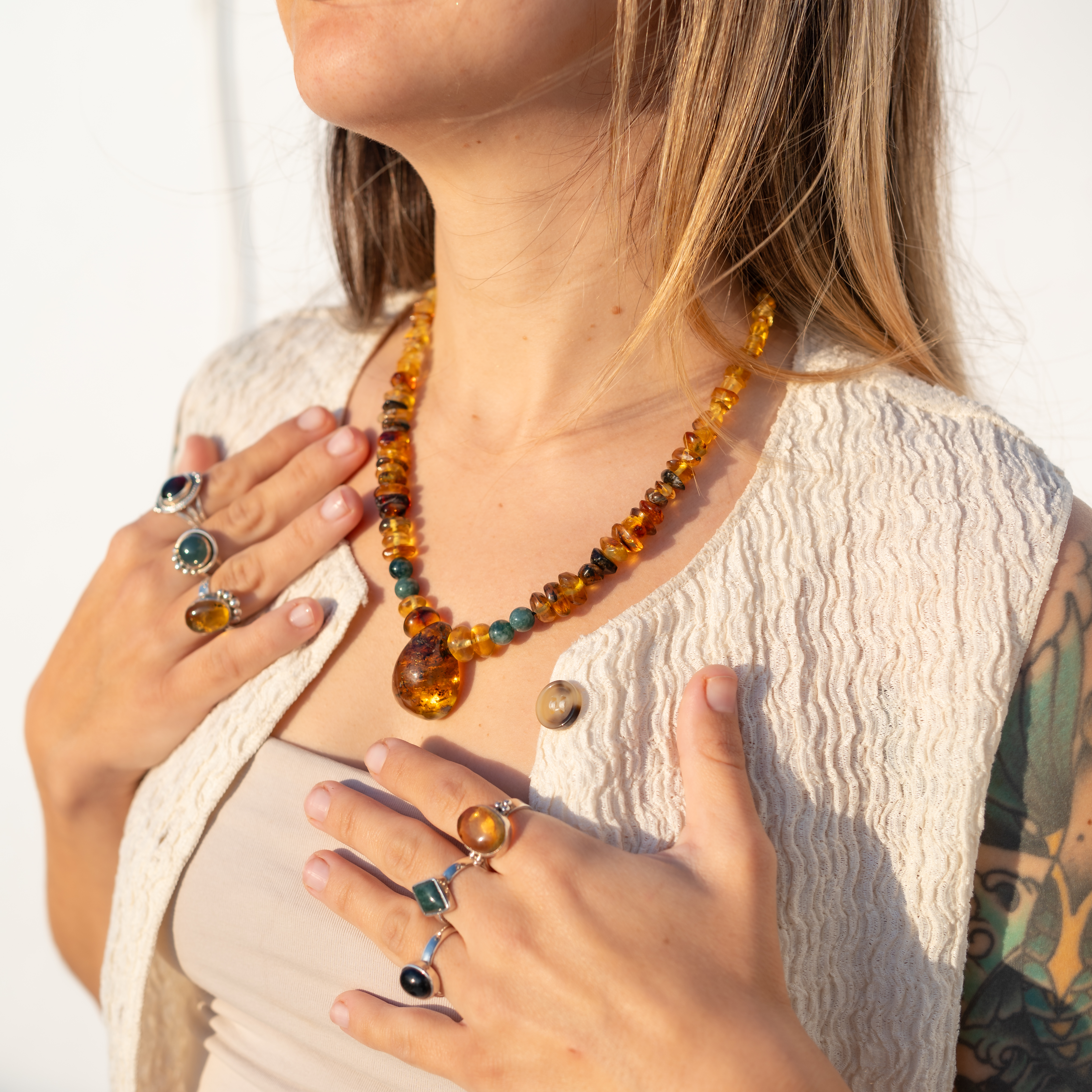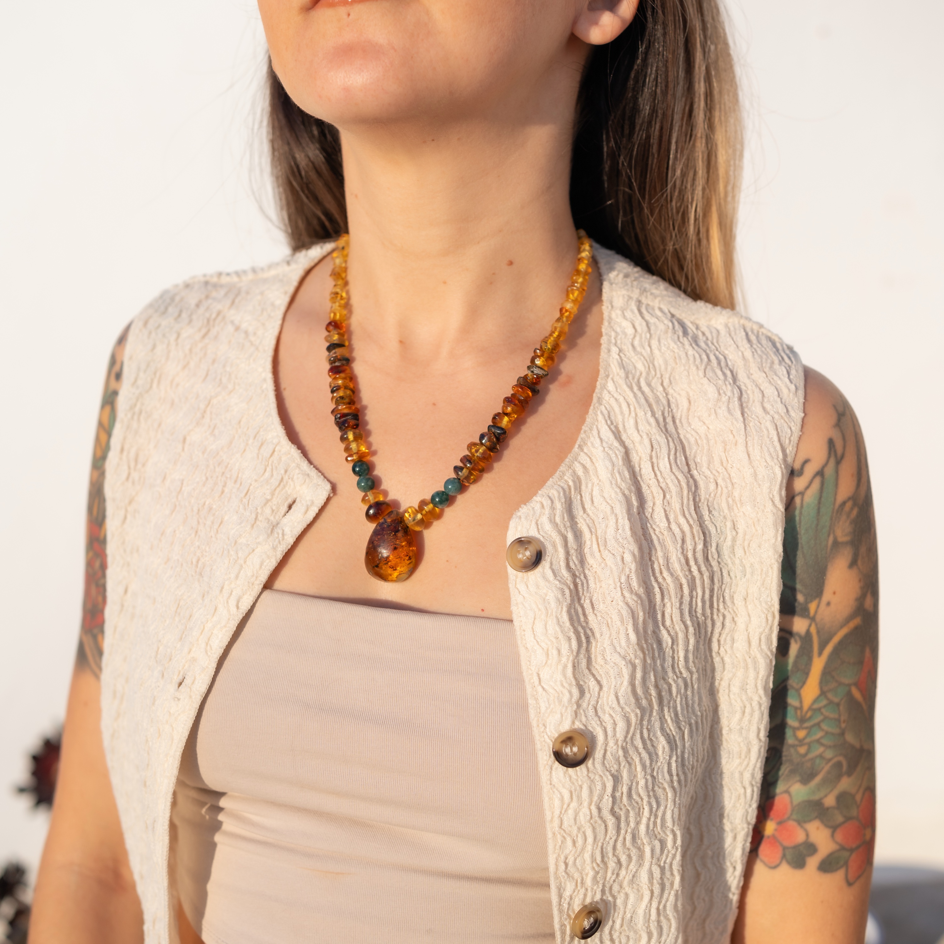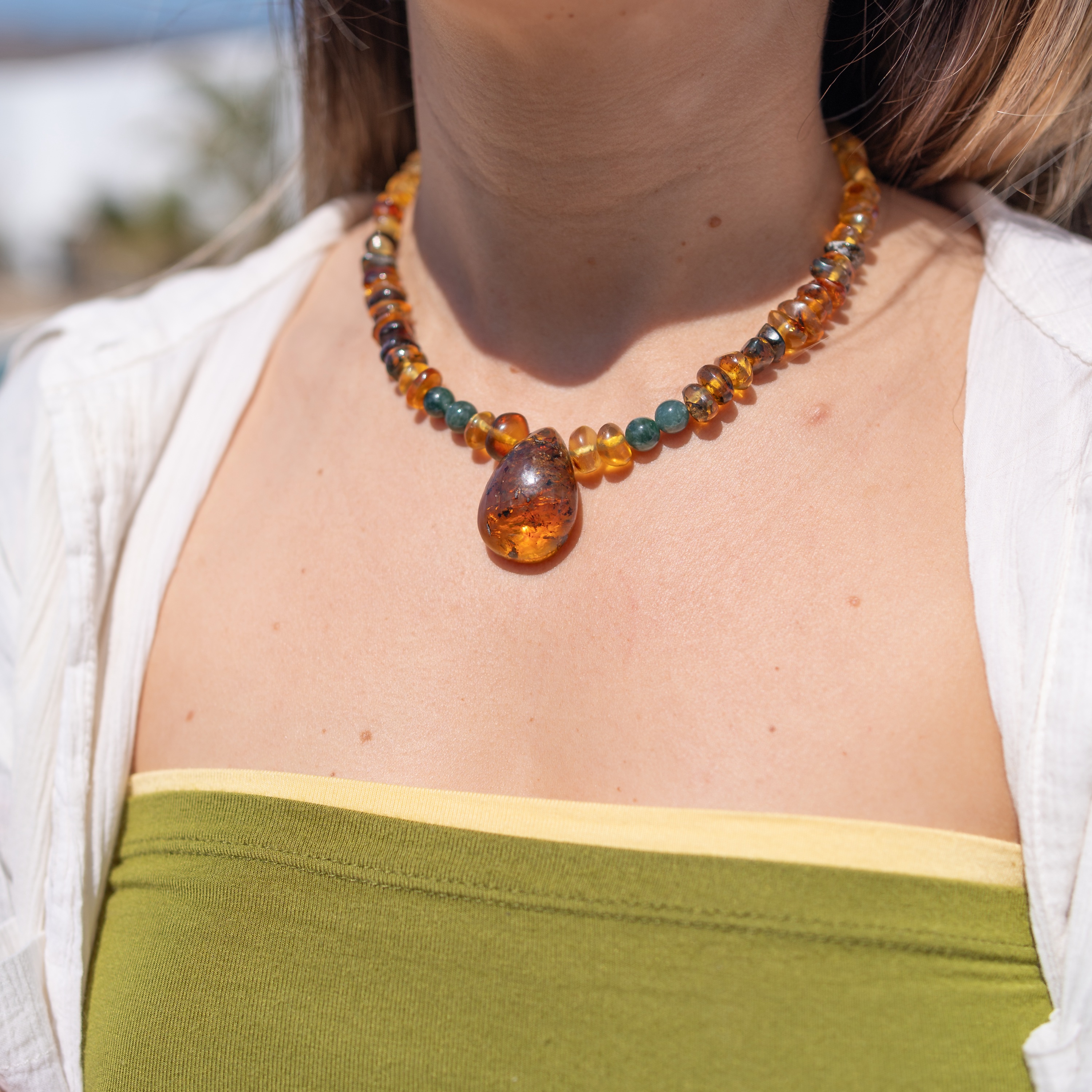 La pieza central de ámbar destaca por sus inclusiones naturales, que cuentan la historia de su formación hace millones de años. Cada collar está hecho a mano en España, respetando las formas naturales de cada piedra.