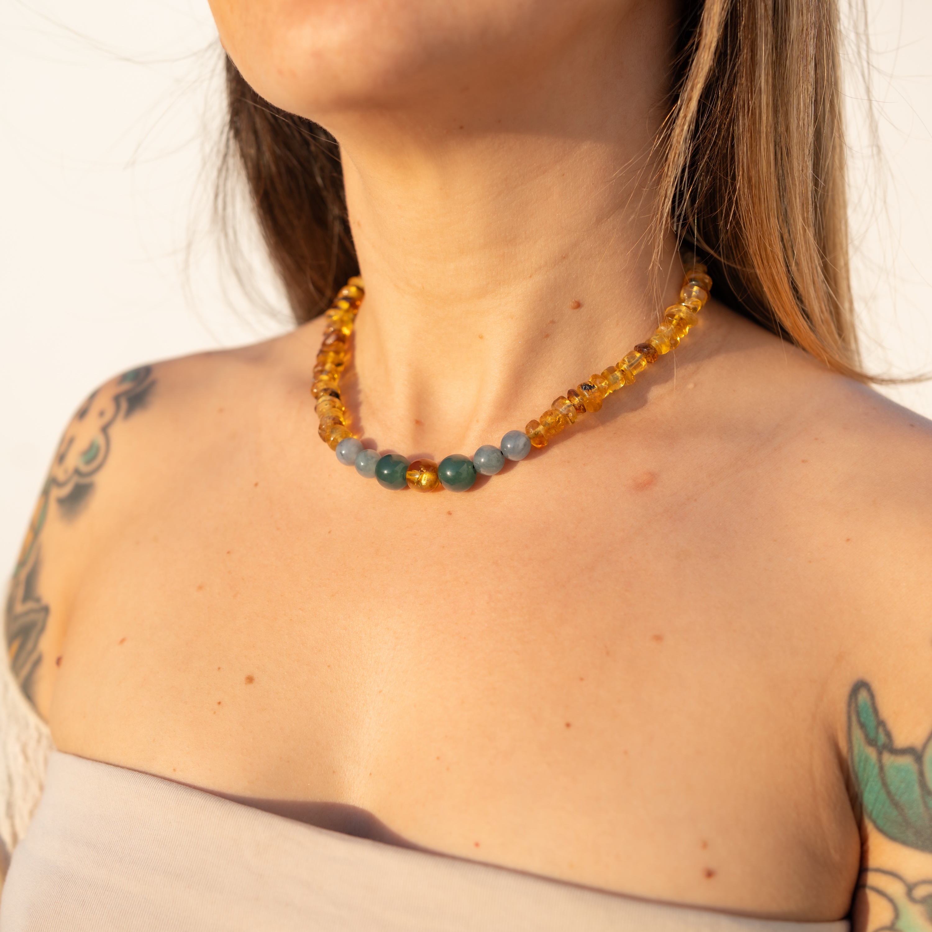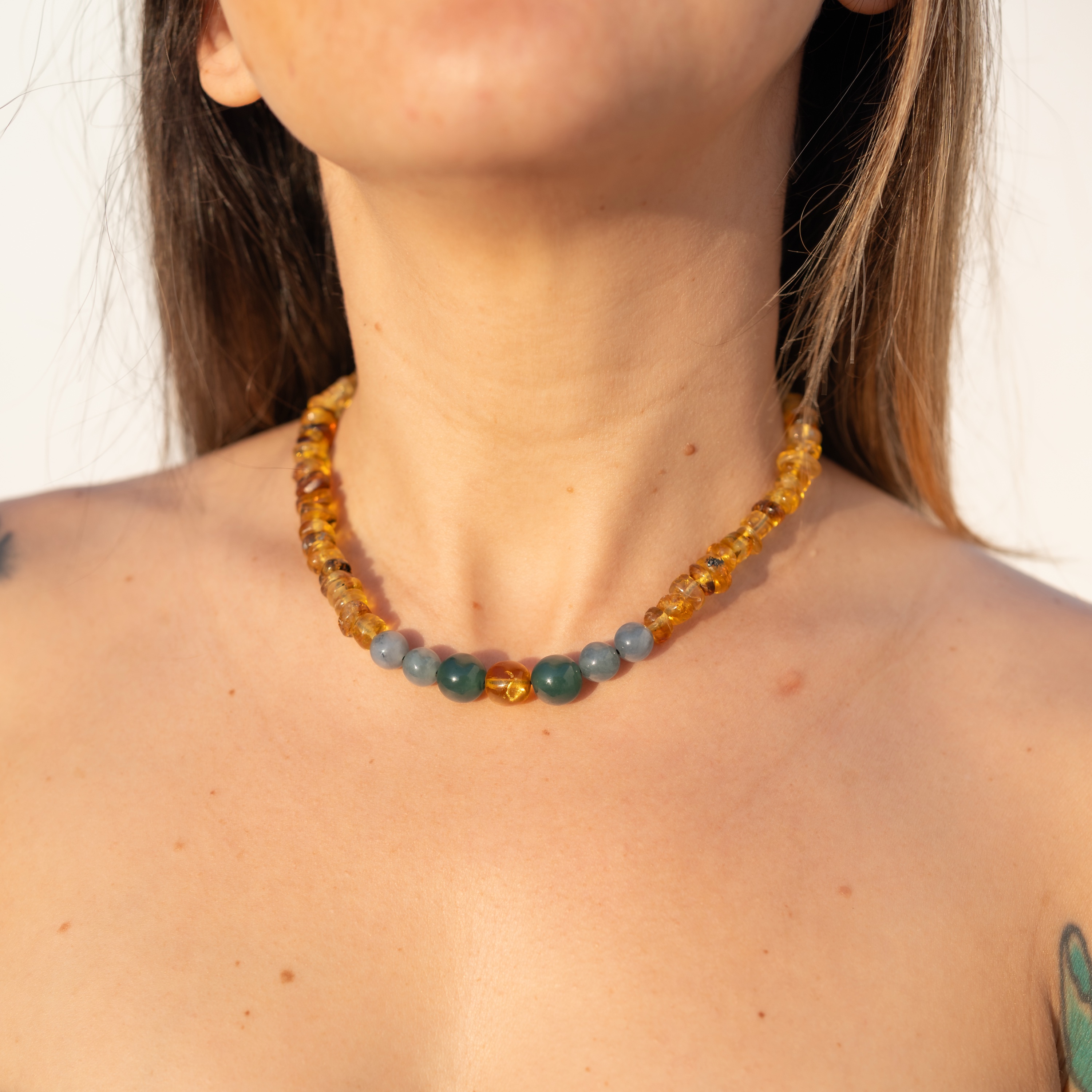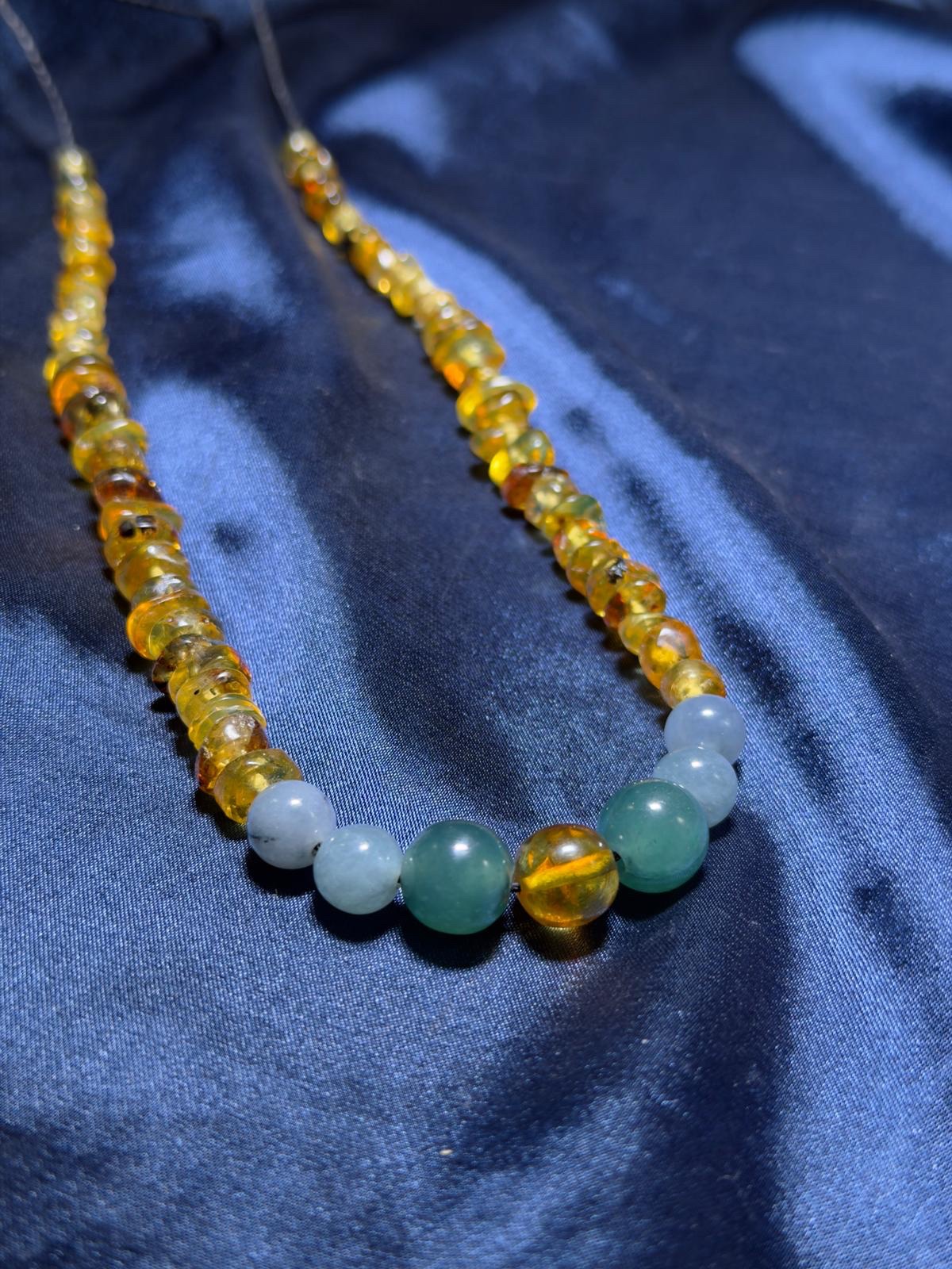 Este collar combina ámbar natural con jadeíta verde y jadeíta azul de Guatemala, dos variedades muy apreciadas por su rareza y belleza natural. La combinación de tonos crea una pieza elegante que transmite equilibrio y sofisticación.