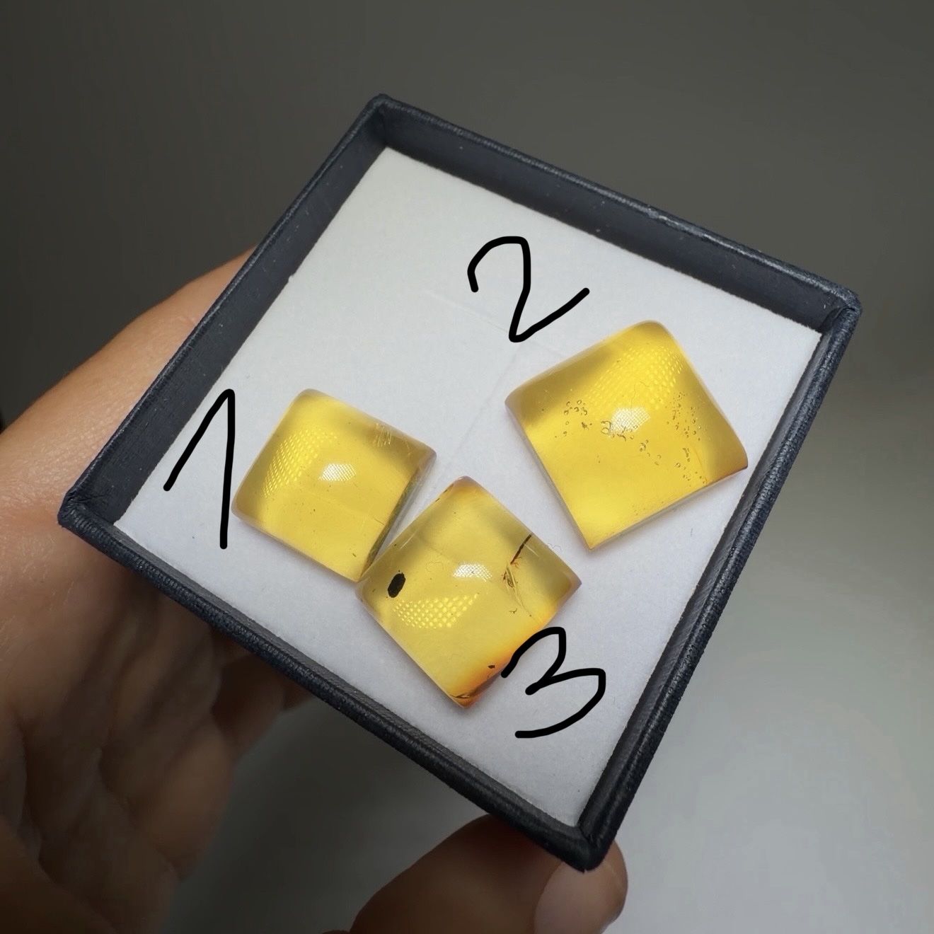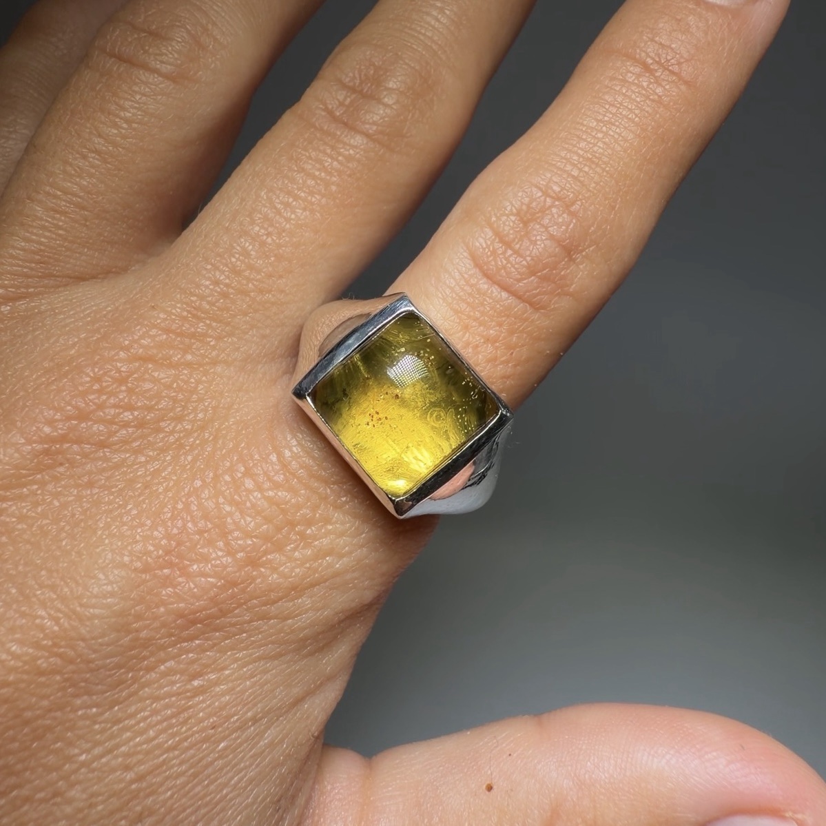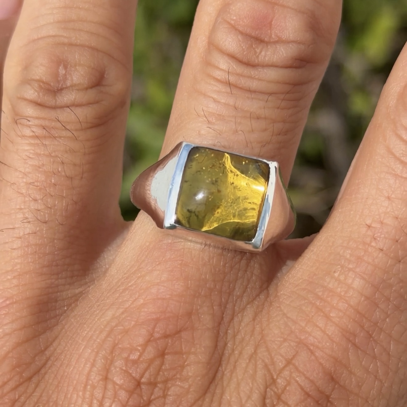 El ámbar del modelo mide aproximadamente 12×12 mm, aunque cada piedra presenta ligeras variaciones naturales que hacen que cada anillo tenga su propia personalidad.